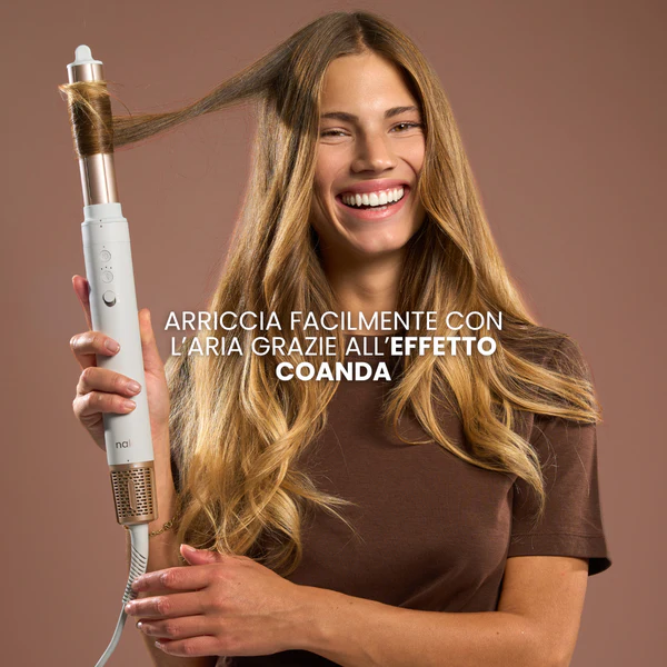 Strumento rivoluzionario per lo styling 5-in-1 che utilizza il flusso d'aria invece del calore diretto — asciuga, liscia, volumizza, arriccia e ond...
